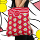 A red tote bag with a mixed pattern of a doodle edelweiss flowers and four white horizontal lines at the very top . Personalize it with an initial . This bag is also available in cyan , light green and black .