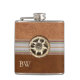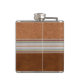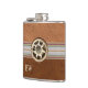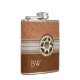 Handsome European inspired drinking flask done in light and dark brown leather look, with a ribbon, running through the middle. A photograph of a bone carved Edelweiss, decorates the middle front, of the flask. Personalize the two letter monogram for yourself or as a great gift idea.