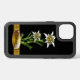 Pretty European inspired Otterbox brand iPhone case done in black, with artwork of two Edelweiss Alpine flowers. A golden band, across the bottom of the case has a decorative text area, with custom black text ready to personalize.