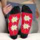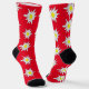A pair of red socks with a pretty edelweiss flower pattern . Also available in black , green and blue .