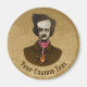 Terrified Edgar Allan Poe watching a gold bug climping on his tie. Colored ink pen sketch. Custom text on circle.