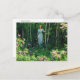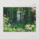 A fine art postcard featuring the painting, Edge of the Woods (1921) by Charles Courtney Curran (1861-1942), an American impressionist artist. A landscape depicting a woman in a blue dress among the trees in the woods, with mountain laurel bushes bearing pink flowers in the foreground.