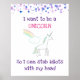 A poster with a unicorn drawing. A fluffy cloud at the end of a rainbow in the background. Pink and purple watercolor confetti decorate the top border. The text says: I want to be a Unicorn so I can stab idiots with my head. Funny, edgy and cute.