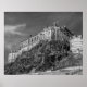 Black and White photograph of Edinburgh Castle sitting atop Castle Rock, taken from the Grassmarket area of Edinburgh. The castle has been involved in many historical conflicts including the wars of Scottish Independence in the 14th century and the Jacobite Rising in 1745. The castle lays claim to being the most besieged building in Great Britain and one of the most attacked places in the world.