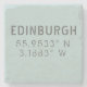 Latitude and longitude map coordinates for Edinburgh, Scotland in modern industrial gray font
