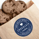 Round Modern Bold "Baked with love" sticker featuring a heart and double border in white against a background color that is editable (click customize and change background color). It's perfect for labeling what you've baked.