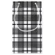 An editable small business or party gift bag with script and decorative letters on a square framed in red on a black and white glen-inspired horizontal plaid pattern with thin stripes.