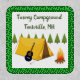 This editable patch features an illustration of a campground with a tent, guitar, a log fire and trees. Above it is the name of the campground and the location. The text is editable so go ahead and change the details as well as the font style, size and colour. The background colour and the edging colour can be changed, as well.