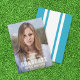 Varsity style photo graduation announcement card. Card has a white stripes pattern against an editable background color (click customize to change) back side.