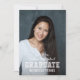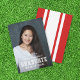 Varsity style photo graduation announcement card. Card has a white stripes pattern against an editable background color (click customize to change) back side.