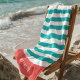 Nautical style beach towel featuring a white stripes pattern with an editable background color, click the customize button for access. To change the turquoise color, select background color and change its color. To change the coral color, select rectangle layer and change its fill color.