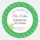A custom retro canning or pickling label with handwritten style script and slab letters, and optional flowering dill weed on a green plaid pattern with small white and blue stripes for pickles, jams or other recipes from your or your small business.