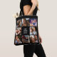Editable photo collage tote bag featuring a black background, 8 family photos, and a text template that is easy to personalize.