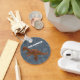 Create a personalized gift that's perfect for dinosaur fans young and old. This keychain features a photo of a plastic toy edmontosaurus dinosaur in a rust orange color with blue spots set against a blue gray background featuring a pattern of fossils of dinosaur footprints. Add your own name or other text in bold white lettering.