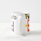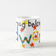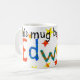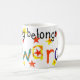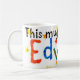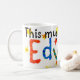 White mug with the inscription 'This mug belongs to Edward' in colourful lettering made from handpainted paper collage.