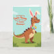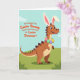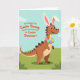 Designed with a friendly cartoon reptile standing upright in warm brown and tan tones, this card places the character on a simple green stretch of grass under a calm blue sky with one white cloud. Large pale cream ears with soft pink interiors sit on its head like a bunny’s, giving it a sweet, slightly bashful look 🐰. The reptile’s wide eyes and gentle smile feel like an inviting glance shared between close friends. Around its neck hangs a garland of five decorated eggs, each in pastel shades of pink, green, purple, and yellow with curving patterns that add texture. The main message appears in the upper left in orange, set in all caps, reading: “WHO NEEDS THE Easter Bunny WHEN YOU CAN HAVE AN Easter Dinosaur?” The layout keeps the character centered while the text stays off to the side, like a teasing comment from a buddy. A single white cloud floats above the scene, and a small cluster of pastel egg shapes frames the neck garland 🌷.