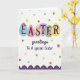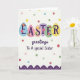 This card features the word “EASTER” across the top, with each letter set inside its own egg-shaped oval, creating a cheerful banner that feels like it’s meant to be shared 🐰. The eggs are colored in a mix of sky blue, soft pink, beige, light lavender, leafy green, and sunny yellow, and the letters are printed in dark purple. Small flower shapes in red, pink, and yellow decorate a few of the egg panels, adding a gentle springtime touch that suggests a caring bond. Below the eggs, a flowing cursive line reads “greetings To A special Sister,” placed centrally and written in a darker ink that stands out clearly against the background. The white backdrop is sprinkled with confetti-like polka dots in assorted colors, including deeper reds and greens along with softer blues and pinks, giving the scene a friendly, celebratory look 🐇. A scalloped border runs along the bottom in rich purple, trimmed with tiny white dot accents that echo the scattered spots above. The lower edge is anchored by that purple scalloped trim, with evenly spaced white dots following each curve.