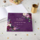 Romantic flowers in shades of rich burgundy, gentle lilac, deep eggplant purple and pinkish orchid pair with modern green botanicals such as ferns and eucalyptus. A deep, eggplant purple watercolor background ties it all together with elegant typography in this romantic wedding guest book. Blank pages inside for guests to sign.