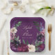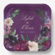 Romantic flowers in shades of rich burgundy, gentle lilac, deep eggplant purple and pinkish orchid pair with modern green botanicals such as ferns and eucalyptus. A deep, eggplant purple watercolor background ties it all together with elegant typography in these romantic wedding / shower paper plates.