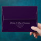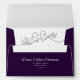 Simple, modern, minimalist, calligraphy eggplant purple 5x7 envelope for wedding invitation with return address and unique couple love birds drawing.