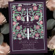 Set the tone for your medieval fantasy wedding with a bold invitation design—a grand sword surrounded by florals against a eggplant background. Perfect for couples dreaming of an epic, romantic celebration. Personalize it for your needs. NOTE: The silver featured in this design is NOT real foil.