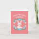 The main focus of the card is the Easter bunny, depicted in a playful pose, holding an intricately decorated Easter egg. The bunny's ears stand tall, conveying a sense of alertness and excitement, as if eagerly anticipating the egg hunt festivities.
