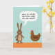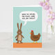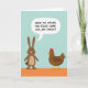 This design shows two cartoon-like animals facing each other on a flat orange ground with a light aqua sky behind them 🌷. On the left stands a small brown long-eared bunny with dot eyes, a faint smile, and a fluffy white tail, leaning slightly forward as if teasing a friend 🐰. On the right is a round brown chicken with a red comb and wattle, a yellow beak, and yellow feet, holding a calm stance that makes the bunny’s challenge feel even more pointed. Their body language reads like a cheeky friendship moment, with one character pressing for answers and the other staying cool and unbothered. A large white speech bubble rises from the bunny and takes up much of the upper area, drawing your eye before anything else. Inside the bubble, the message is written in thick, dark, all-caps lettering: “SHOW ME WHERE THE EGGS COME OUT, YOU POSER!” The background stays simple and flat, with no shading, keeping the focus on the two figures, the white bubble, and the orange-and-aqua color contrast.