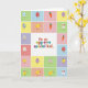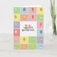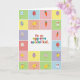 This greeting card features a neat grid of pastel squares framing a bright white center panel that reads “for an egg-stra special kid.” The words sit centered, with each letter in a different cheerful color like red, green, purple, and teal, giving the message a friendly rhythm. Around the text, the border squares alternate soft shades such as sage, sky blue, daffodil yellow, apricot, lavender, and rosy pink, like a patchwork quilt. Inside the squares are simple spring icons: patterned eggs with tiny red feet, little yellow chicks with orange beaks that look like they’re waving hello, and orange carrots topped with fresh green leaves. Smiling white rabbits with long ears outlined in red peek out from several panels 🐰, their faces angled as if sharing a sweet, knowing glance with the chicks nearby. The repeated red feet and ear accents tie the scenes together, making the characters feel like they belong in the same friendly circle 🌷. The border is made of evenly sized squares, each holding one small drawing set against a single pastel color.