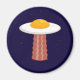 Vector cartoon illustration of a delicious sunny side up fried egg UFO with a yummy bacon slice tractor beam. Keywords: egg, bacon, breakfast, UFO, alien, sunny, side, cartoon, space, extraterrestrial, food, cute, yolk, sci-fi, science, fiction, martian, humor, meat, pork, abduction