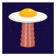 Vector cartoon illustration of a delicious sunny side up fried egg UFO with a yummy bacon slice tractor beam. Keywords: egg, bacon, breakfast, UFO, alien, sunny, side, cartoon, space, extraterrestrial, food, cute, yolk, sci-fi, science, fiction, martian, humor, meat, pork, abduction