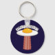 Vector cartoon illustration of a delicious sunny side up fried egg UFO with a yummy bacon slice tractor beam with EGGSTRATERRESTRIAL text. Keywords: egg, bacon, breakfast, UFO, alien, sunny, side, cartoon, space, extraterrestrial, food, cute, yolk, sci-fi, science, fiction, martian, humor, meat, pork, abduction