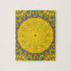 This artwork features a central, circular design that resembles a stylized sun or flower. The central motif is highly symmetrical and detailed, creating a striking focal point. Surrounding it is a background filled with a repeating pattern of smaller circular shapes, enhancing the overall composition's balance and visual density.