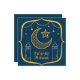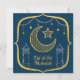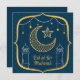 Custom Modern Elegant Blue Eid al fitr Mubarak greeting cards featuring a gold moon crescent and stars pattern.