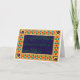 An Eid greeting in green lettering on a dark blue background, surrounded by an ornate border based on a traditional Islamic pattern on interlocking stars with moons in each corner. This richly colored greeting card design includes outlining in gold gouache paint and is an original design, handpainted by Judy Adamson. The inside is blank for your own message. See also matching mug in the same style.