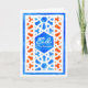 An Eid Greeting card with a traditional Islamic Lattice pattern in white on a blue and orange background. The text in the central pane; is in white and reads, 'Eid Mubarak'. Design handpainted in watercolors by Judy Adamson. The inside is left blank for your own message.