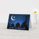 Eid Greeting illustration with silhouettes of the moon, stars and a mosque on a blue night sky.