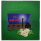 Eid Greeting illustration: A 3D greeting card with Eid greetings inside - people with camels on their way to the mosque. The card is decorated with a white rose with water drops, both on a green background.