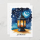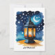 The image is a digitally created Eid card featuring a traditional lantern against a night sky backdrop. The lantern is the central focus, depicted with intricate designs and a warm, glowing light emanating from within, suggesting it is lit. Inside the lantern, a silhouette of a mosque or similar architectural structure can be seen, reinforcing the Eid theme. The background is a watercolor-style painting of a dark blue night sky dotted with stars and a crescent moon, commonly associated with Islamic imagery and the celebration of Eid. The overall aesthetic is soft and dreamy, with the watercolor effect adding a touch of artistry to the card. The color palette is dominated by blues, oranges, and yellows, creating a visually appealing contrast. The card likely aims to convey a festive and spiritual mood, appropriate for the occasion of Eid. Eid Mubarak is a common greeting used during the Eid celebrations, which marks the end of Ramadan.