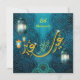 A beautiful and elegant golden Arabic Eid Mubarak calligraphy with islamic lanterns, teal turquoise arabic floral ornamental background greeting card. Send your love and wishes to your family, friends and loved one's by our beautiful and elegant designs greeting cards. In the back side it has a beautiful golden Arabic best wishes calligraphy. If you want you can easily change or remove by clicking personalised this template.