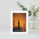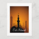 A postcard for Eid festive featuring many mosques overlaying silhouettes in orange background with circular gradient.
