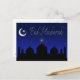Eid Greeting illustration: Eid Mubarak lettering made with glowing stars, Moon with big star and a mosque silhouette on a night sky background.