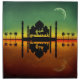 Eid Mubarak greeting illustration: a mosque and palms silhouette on a night sky background with the moon and stars reflecting on water.