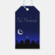 Eid Mubarak greeting illustration: Eid Mubarak lettering made with glowing stars. Islamic symbol moon with star and a mosque silhouette on a night sky background.