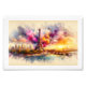 The Eiffel Tower stands prominently with a burst of colorful splashes around it. The skyline features a warm and dreamy sunset.