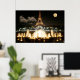 The Eiffel Tower bathed in yellow illuminations and framed by a massive moon and spectacular fountains.