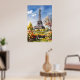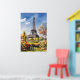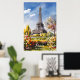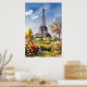This watercolor painting captures the iconic Eiffel Tower in Paris, France, surrounded by a vibrant display of spring flowers in bloom. The scene evokes a sense of romanticism and tranquility, with the tower standing tall against a bright blue sky.