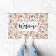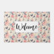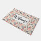 A welcome doormat with an elegant pattern. Pink roses, blue-gray butterflies and an Eiffel tower. A French themed pattern.