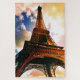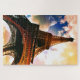 An upshot of the Eiffel Tower in Paris, France, with pink and yellow clouds against a blue sky and a red metal tower.
