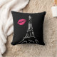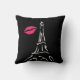 Bright pink lips, accent this stylish sketch of the Eiffel Tower on this black cushion.
