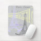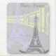 Gray background with several images of the Eiffel Tower in yellow, blue, light and dark gray. Also, several images of the words "Paris, France" in different sizes and colors.